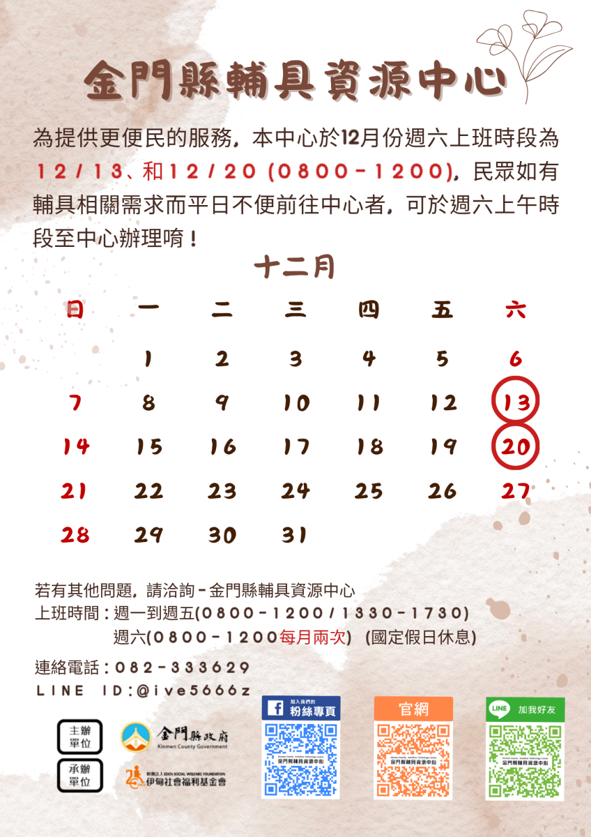 民眾如有輔具相關需求而平日不便前往中心者,可於此時段至中心辦理!